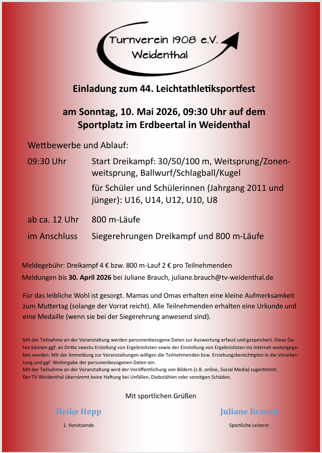 Auf dieser Seite findest Du alle wichtigen Termine zu den aktuellen Vereinsveranstaltungen des laufenden Jahres 2026, kalendarisch sortiert nach allgemeinen & sportlichen Ereignissen sowie verlinkt mit früheren Veranstaltungen, Ergebnislisten & Informationsflyern: