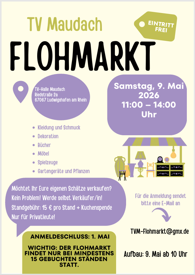 Am Samstag, den 9. Mai 2026, findet von 11 bis 14 Uhr erstmals ein eintrittsfreier TV-Maudach-Flohmarkt in der vereinseigenen TVM-Halle statt.