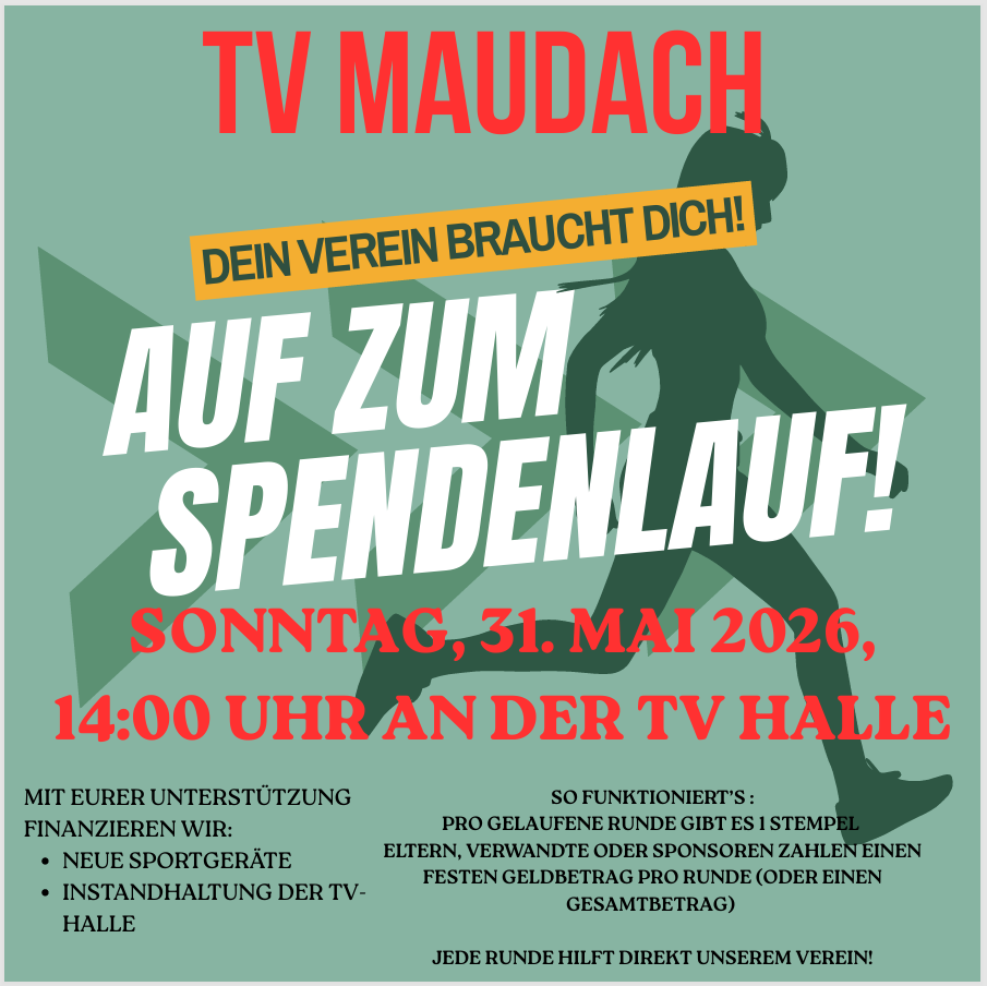 All unsere Mitglieder, deren Freunde und Verwandte sowie ebenso Nicht-Mitglieder sind herzlich dazu aufgerufen als Läufer und/oder Sponsor am Sonntag, den 31. Mai. 2026, um 14 Uhr auf dem Sportplatz hinter der TVM-Halle an unserem TV-Maudach-Spendenlauf teilzunehmen.
