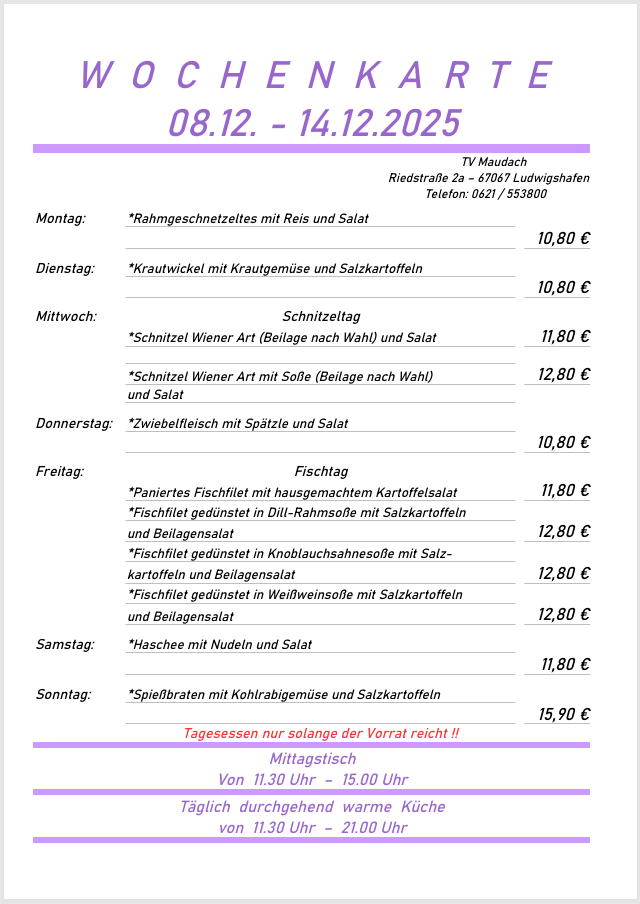 Speisekarte, Wochenkarte & Saisonkarte